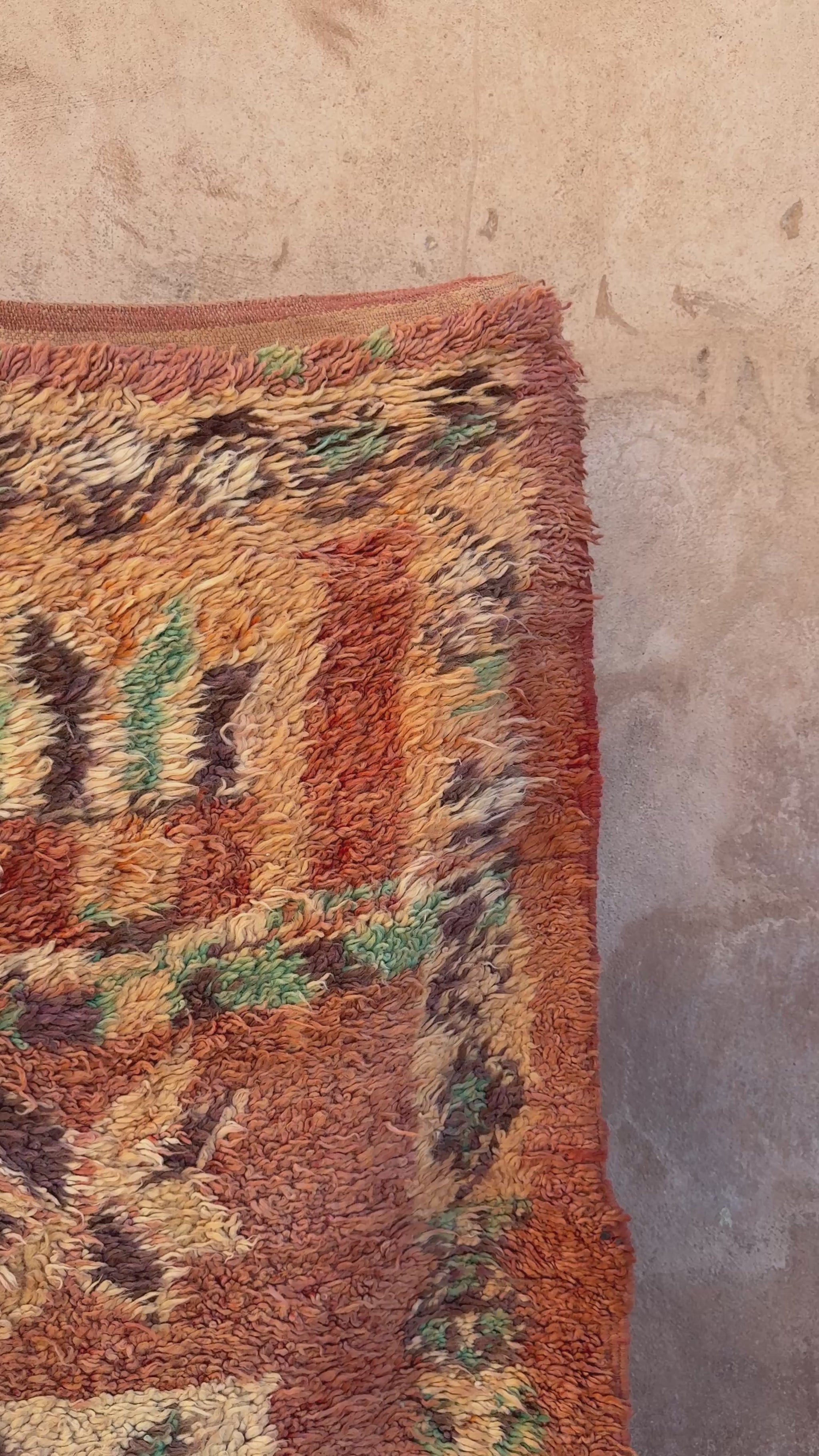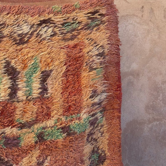 Warm, textured, and full of vintage soul, this Moroccan rug features a charming patchwork-style grid of floral star motifs in earthy shades of terracotta, sage green, honey, cream, and soft coral. The hand-knotted pile carries a beautifully worn patina that enhances its rustic character, while the subtle color variations give the design depth and movement. Perfect for cozy, boho, or nature-inspired interiors, this unique rug adds warmth, artistry, and handcrafted charm to any space. Its inviting palette makes it especially easy to style in living rooms, bedrooms, or layered spaces seeking a touch of timeless Moroccan craftsmanship.
