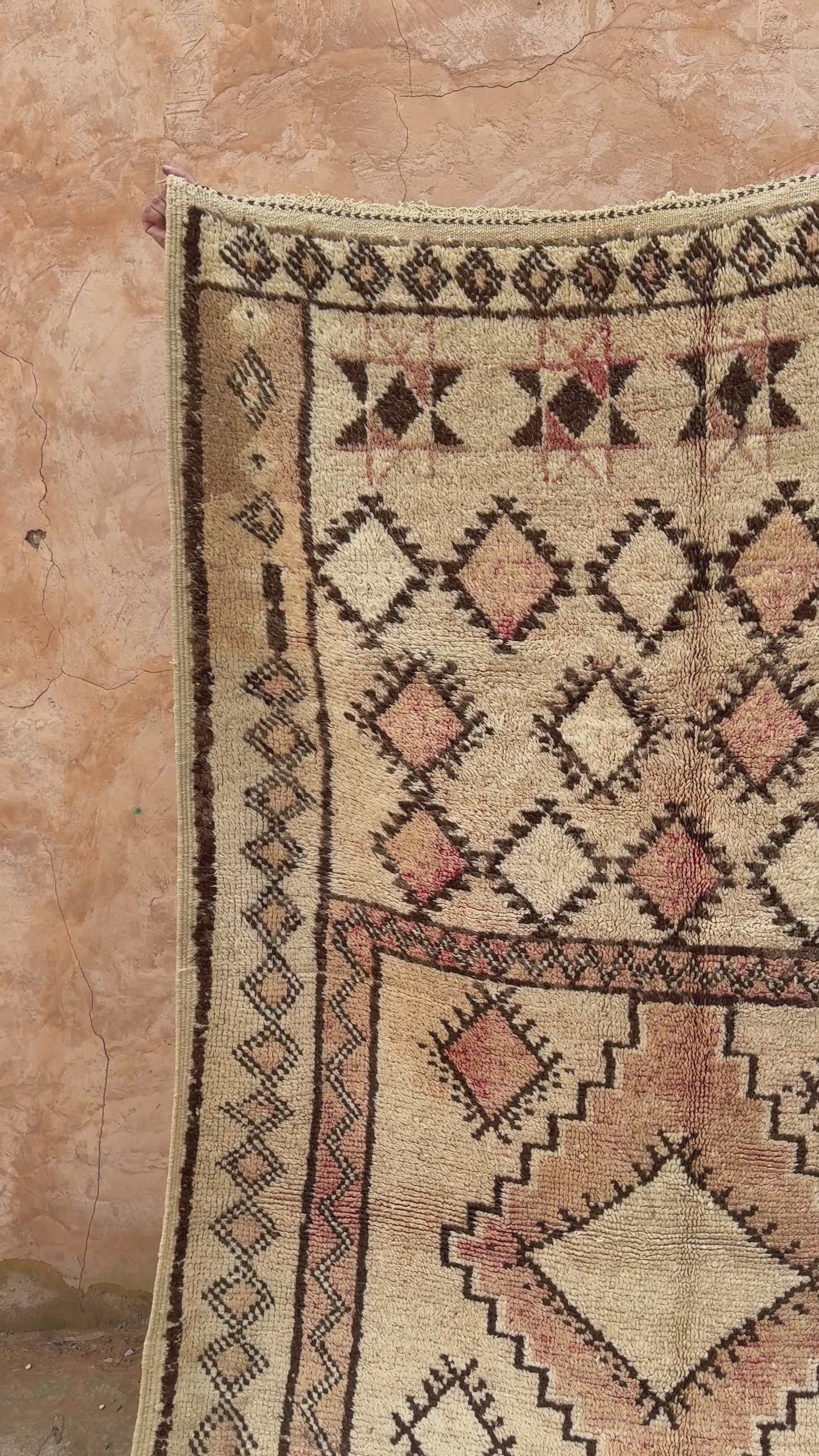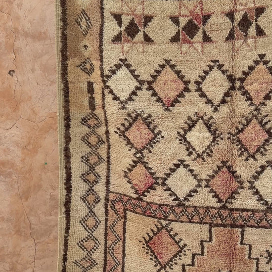 Invite understated warmth into your home with this large vintage Boujaad Moroccan rug, a beautifully balanced piece handwoven by Berber artisans. Its soft cream field is framed by graphic tribal borders and adorned with diamond motifs in blush and earthy brown tones, creating a design that feels both structured and organic.