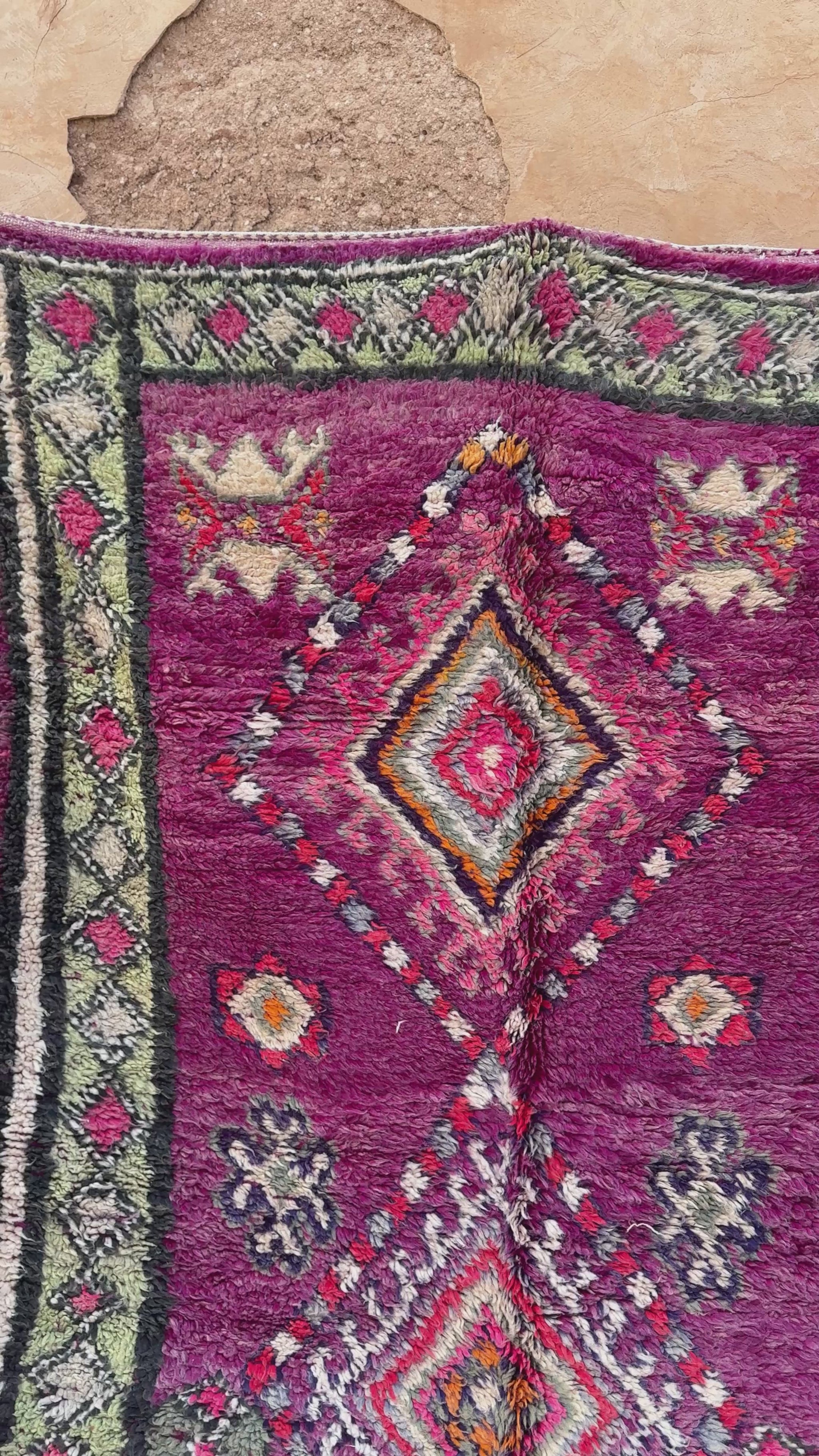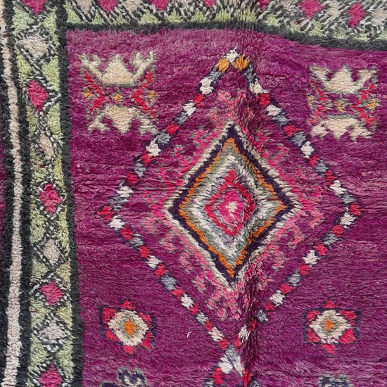 Make a bold and soulful statement with this large vintage Boujaad Moroccan rug, handwoven by Berber artisans and rich in colour and symbolism. Its striking plum field is framed by graphic tribal borders in olive and ivory, while layered diamond motifs and symbolic elements create a dynamic, almost tapestry-like composition.