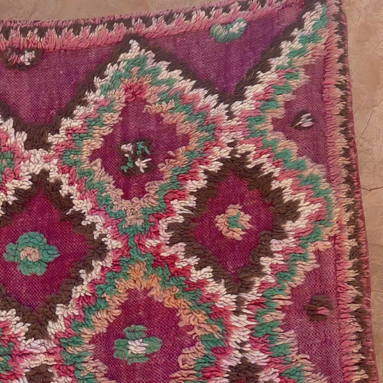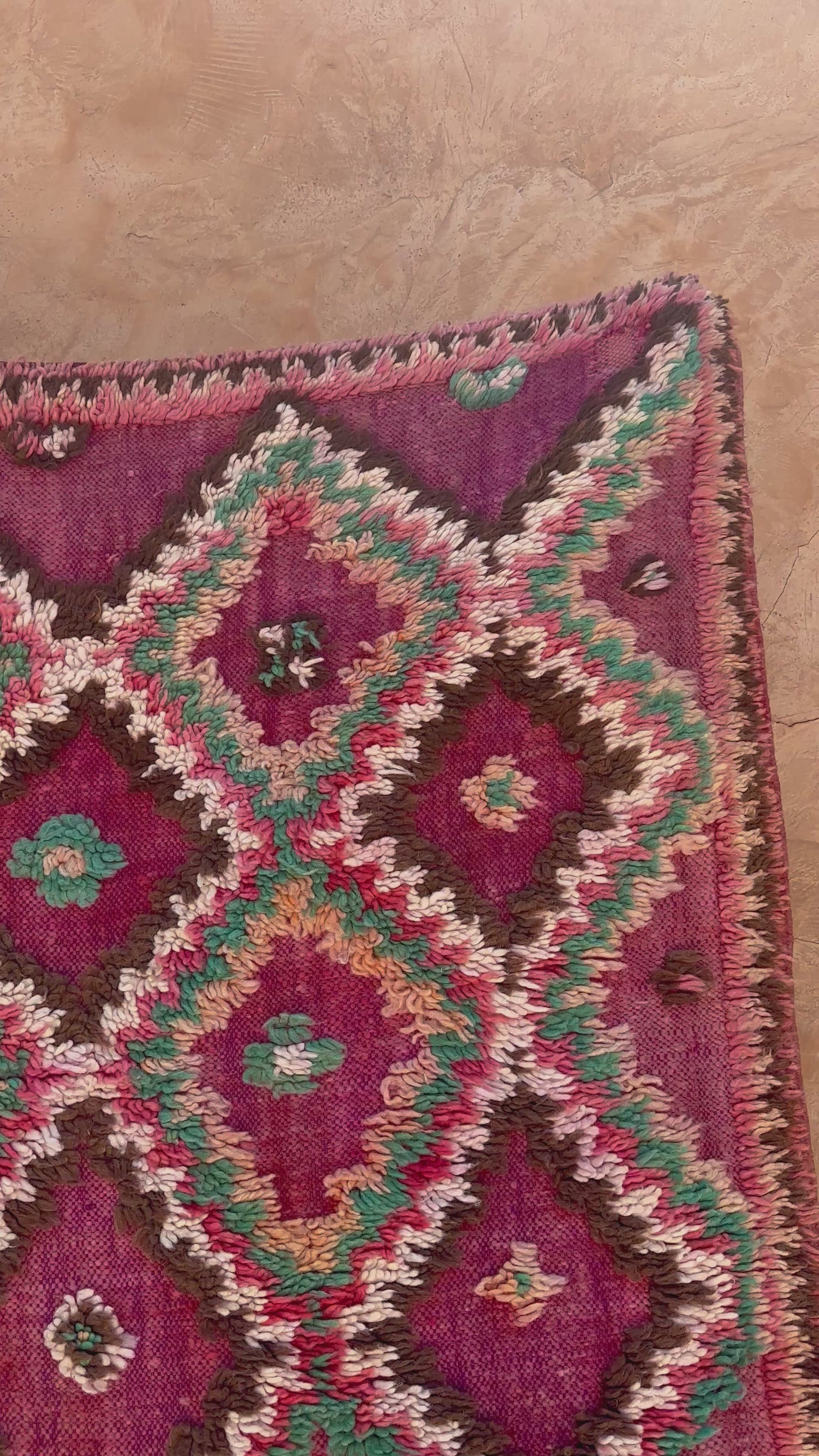 This vintage Moroccan Boujaad rug comes in stunning shades of burgundy and pink, accented with soft green and brown and ivory diamond motifs. Handwoven in the Atlas Mountains, it carries the signature Boujaad charm with rich tones and symbolic patterns. The texture varies across the rug, where different weaving techniques create areas of softness and depth, giving it a truly one-of-a-kind character. A timeless piece of Berber artistry that adds warmth, elegance, and cultural beauty to any interior.