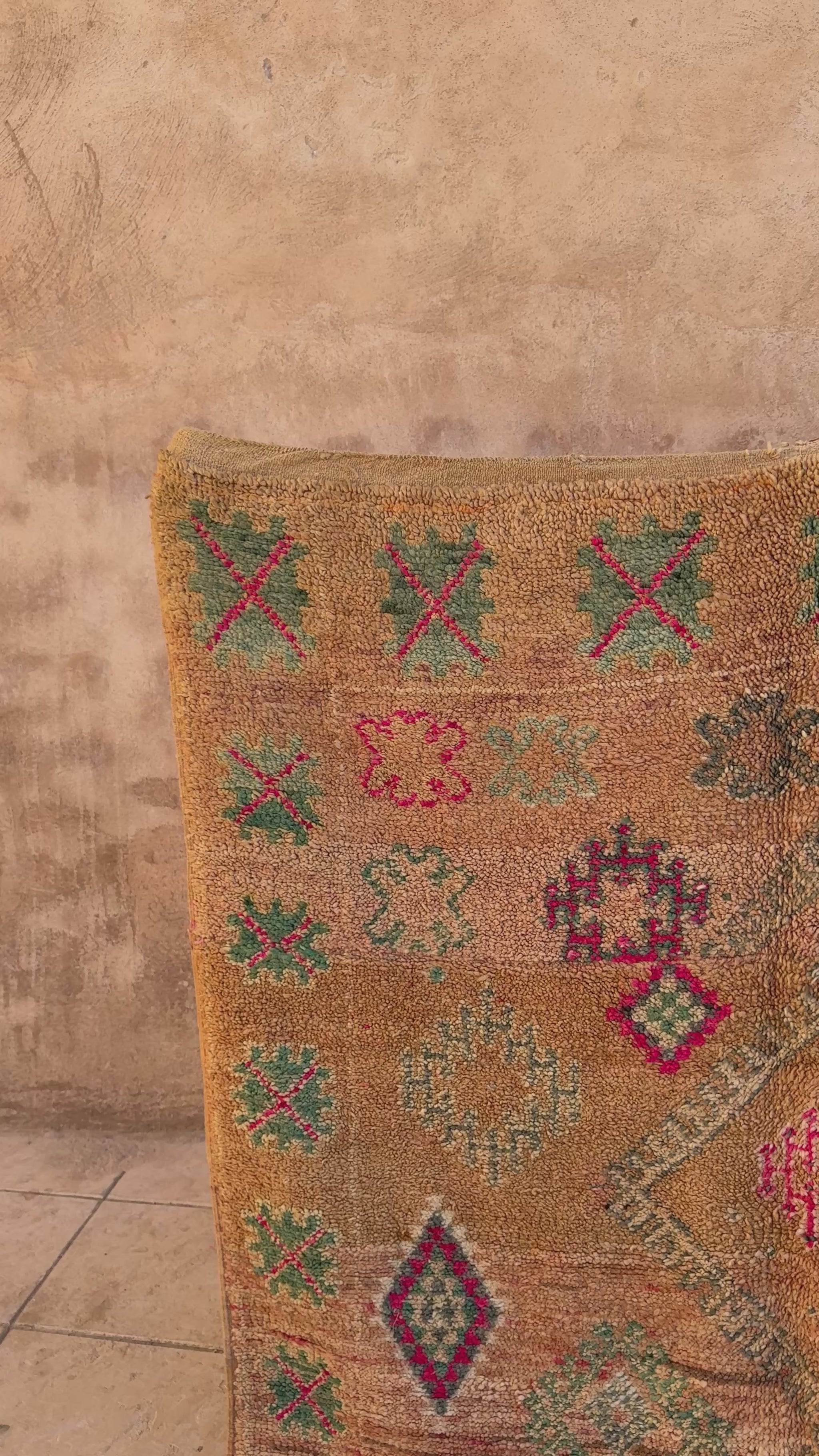 Colourful and full of personality, this vintage Moroccan rug features a lively mix of tribal motifs and geometric symbols handwoven across a warm caramel-toned background. Pops of emerald green, magenta, rose, and soft teal bring playful energy to the design, while the aged patina and textured pile add depth and authenticity. Centred with layered diamond patterns and surrounded by scattered Berber symbols, this piece is rich in cultural charm and artisanal detail. Perfect for boho, eclectic, or globally inspired interiors, this unique rug adds warmth, vibrancy, and handcrafted beauty to any space.