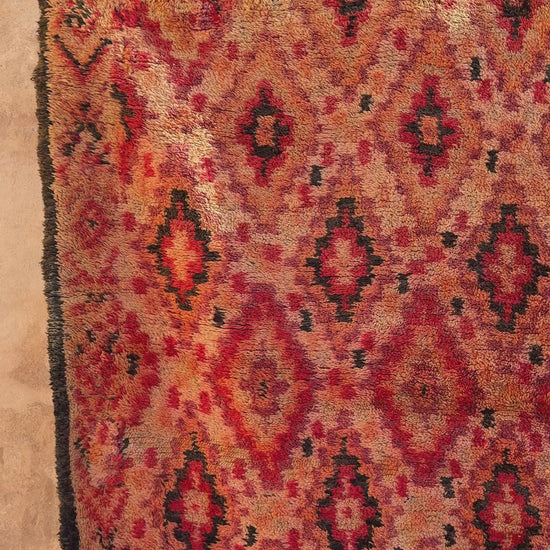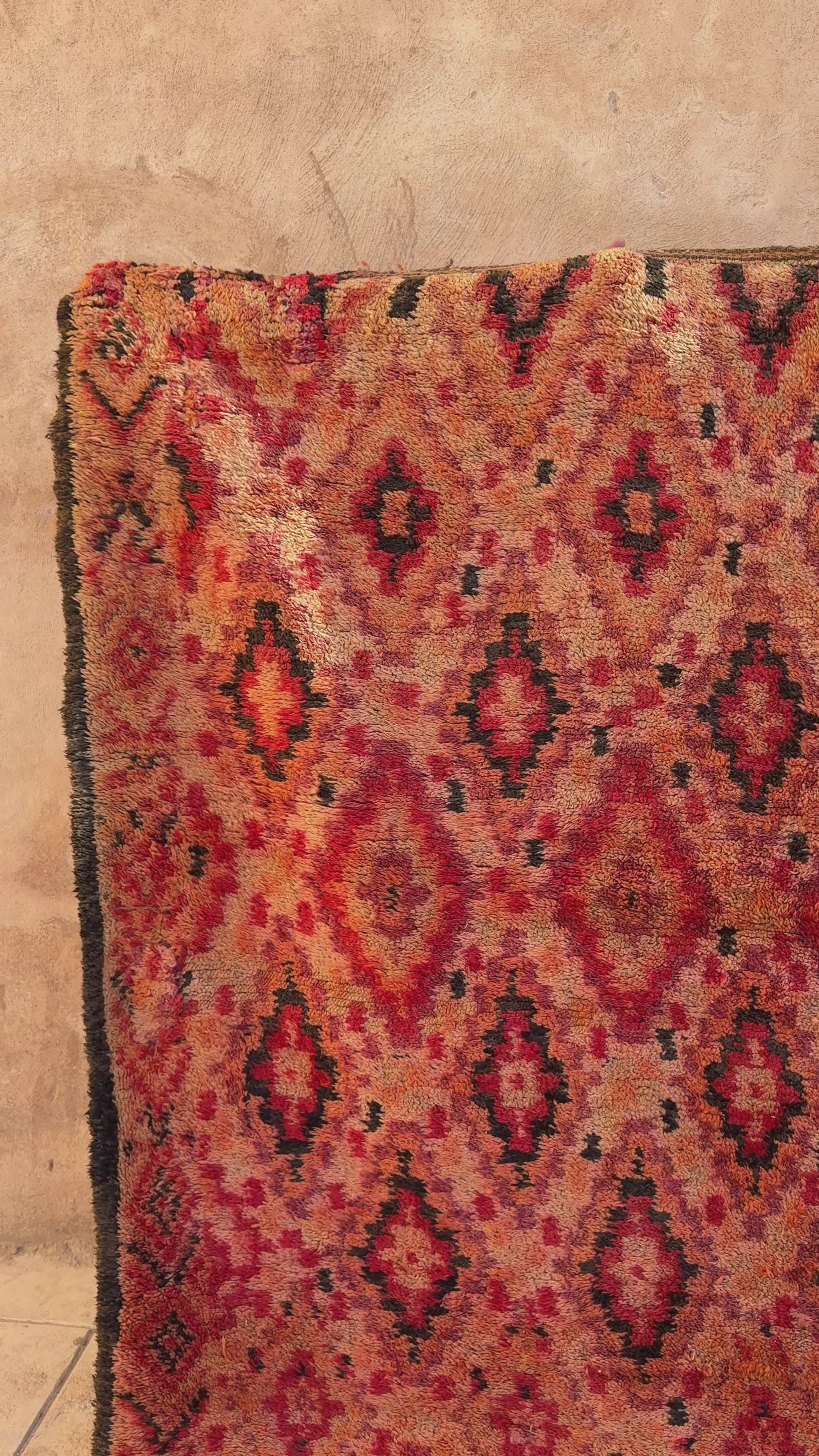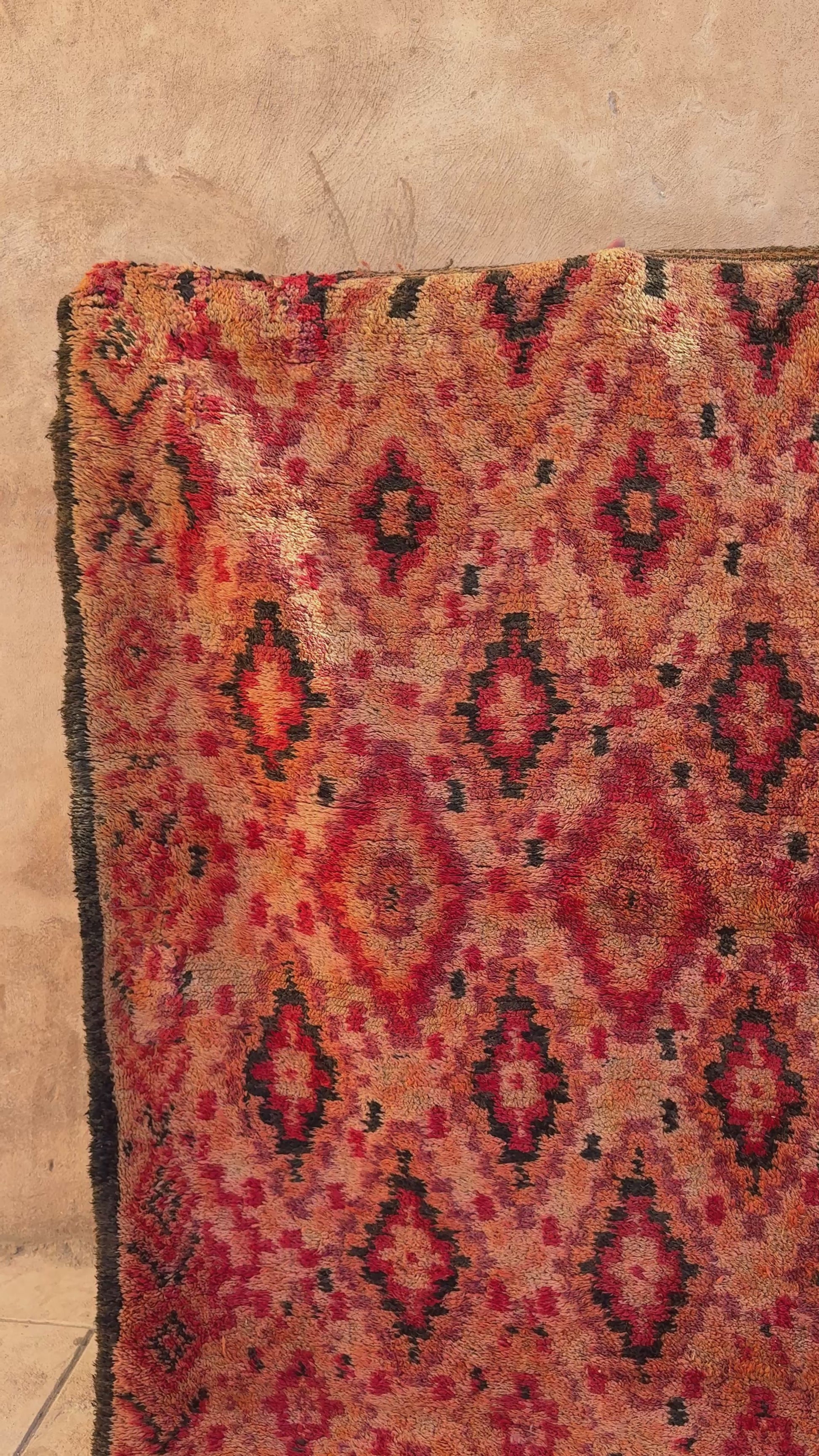 Radiating warmth and depth, this vintage Moroccan rug features a mesmerising repeat of diamond motifs in fiery shades of burnt orange, deep red, black, and touches of terracotta. Its richly textured, hand-knotted pile and naturally faded patina give it a bold yet timeworn character that feels both earthy and artistic. The generous, oversized dimensions make it an exceptional statement piece—perfect for anchoring spacious living rooms, open interiors, or large boho-inspired spaces. We haven’t found another one quite like it, making this rug truly one of a kind and a rare example of authentic Berber craftsmanship infused with vibrant desert energy.