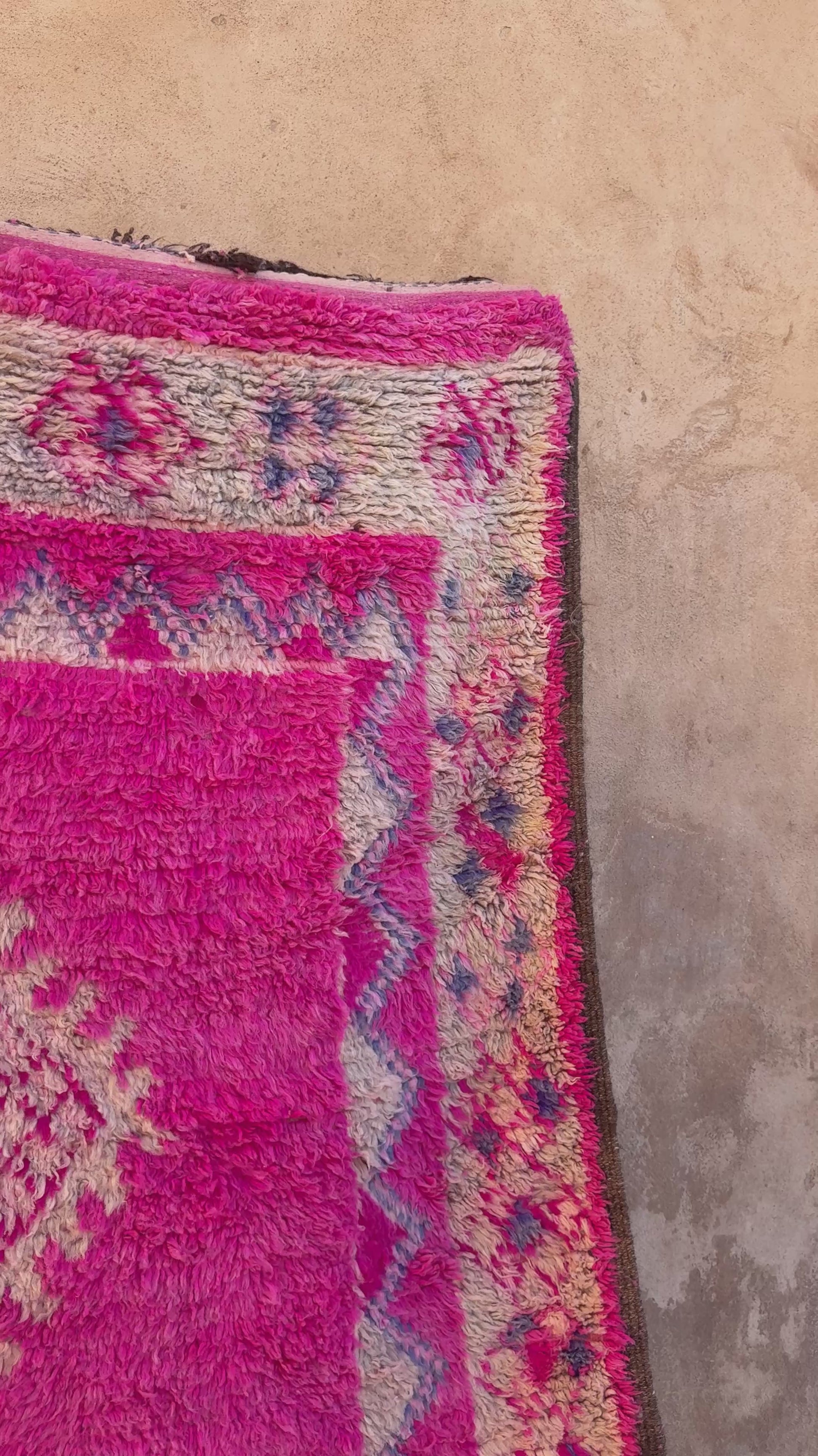 Bright and eye-catching, this vintage Moroccan rug brings a burst of vibrant Pink balanced with soft neutrals and intricate Berber diamond motifs. The plush hand-knotted pile creates a luxurious texture, while the patterned border adds depth with touches of indigo, rose, and nuetrals. Its naturally aged patina gives it warmth and authenticity, making it a standout piece for boho, eclectic, or modern interiors in need of bold colour and artisan charm. Perfect for living rooms, bedrooms, or creative spaces, this unique rug instantly energizes any room with its lively palette and timeless craftsmanship.