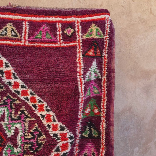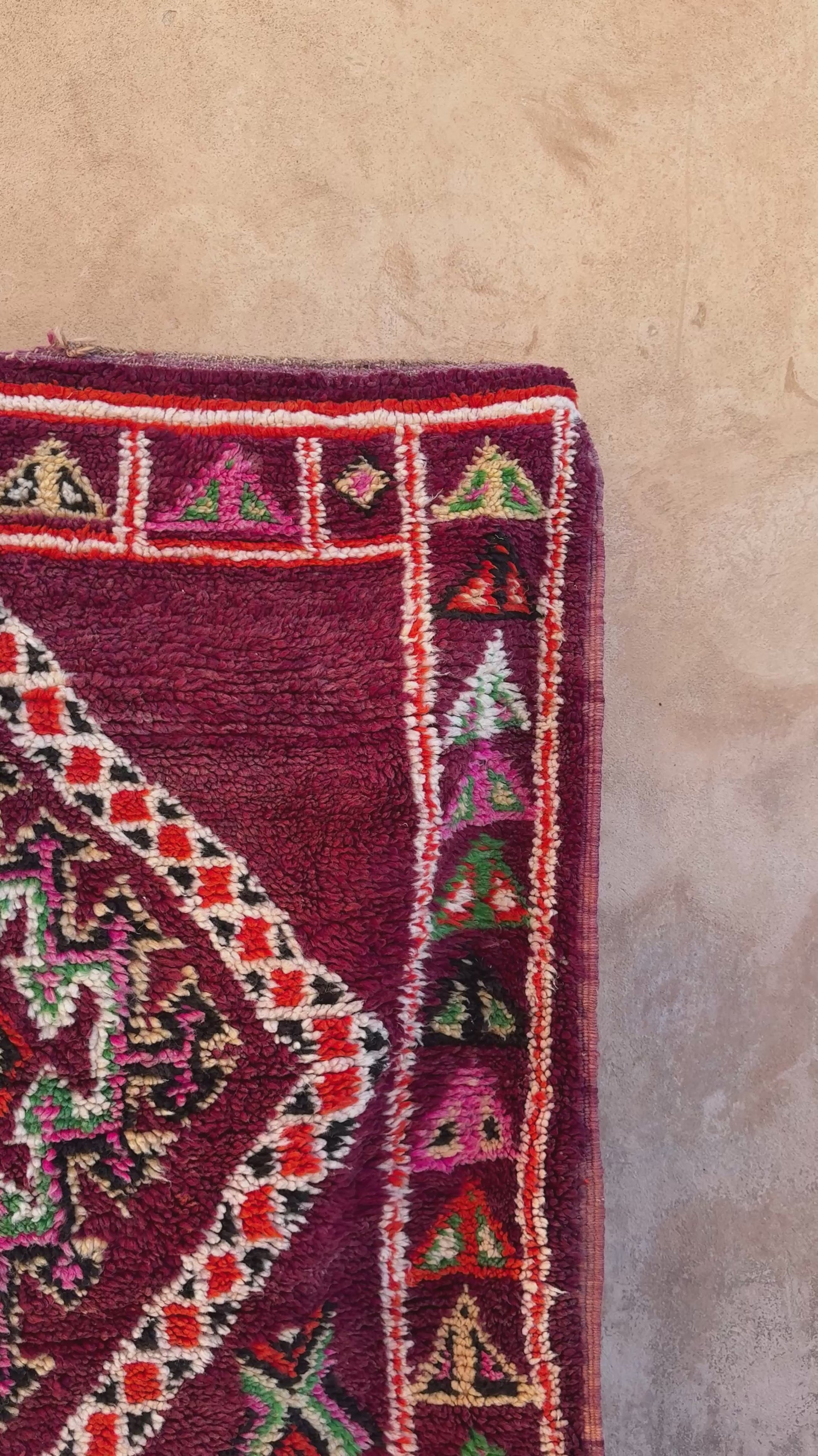 Vibrant and full of life, this vintage Moroccan rug showcases a rich wine-red backdrop adorned with intricate diamond motifs and traditional Berber symbols in shades of emerald, rose, ivory, and amber. The detailed hand-knotted patterns create beautiful texture and depth, while the bold border frames the design with striking geometric artistry. Its lush pile and gently aged patina add warmth and authenticity, making it a standout piece for boho, eclectic, or globally inspired interiors. Perfect for adding colour, character, and cultural charm to any room, this rug brings timeless craftsmanship and eye-catching beauty to your space.