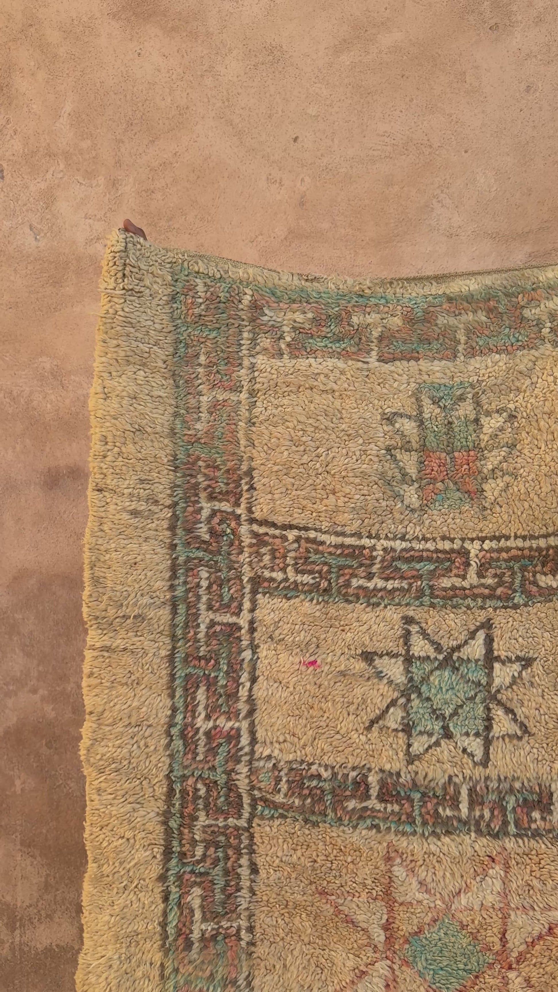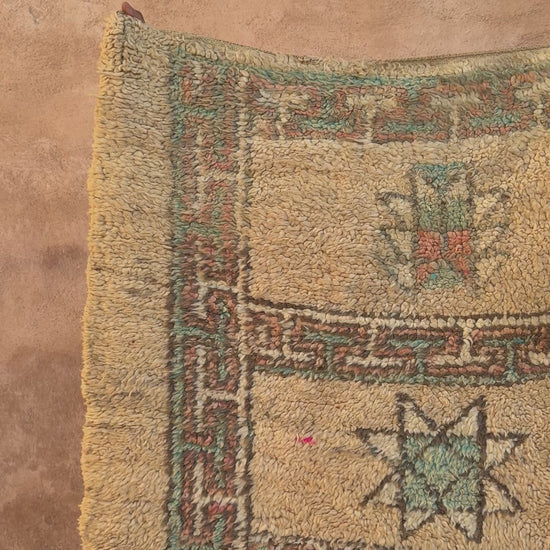 This vintage Moroccan rug features a beautifully aged palette of soft ochre, sage green, and muted terracotta, arranged in a grid of hand-knotted star motifs and tribal symbols. It's plush, shaggy texture and naturally faded patina give it a warm, earthy character that feels both rustic and refined. Framed with a traditional geometric border, the design blends subtle colour variation with timeless Berber artistry. Perfect for neutral, boho, or organic modern interiors, this one-of-a-kind rug brings gentle colour, texture, and authentic craftsmanship to any space.